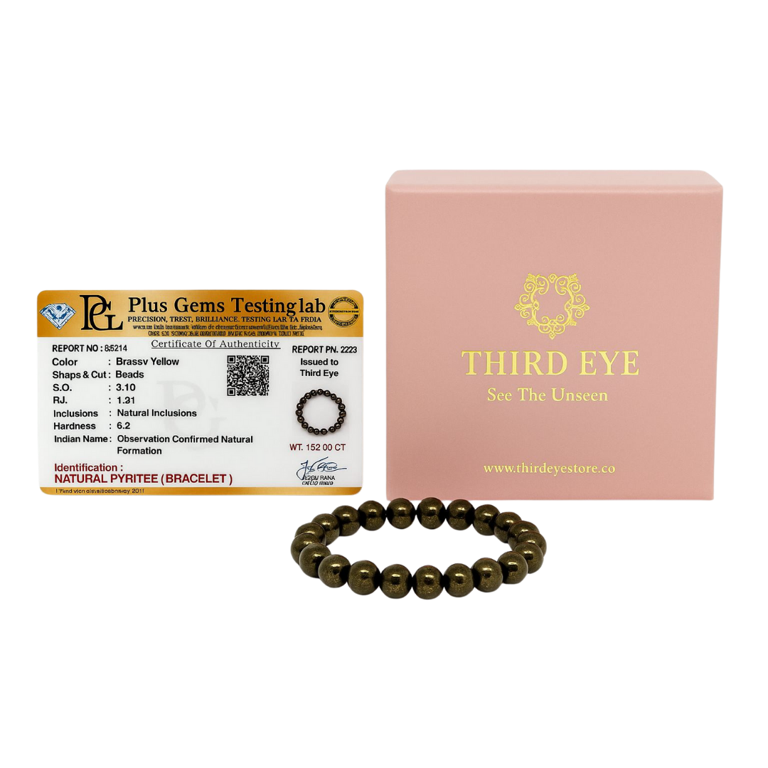 Crafted from high-quality, authentic Pyrite and verified by a lab certificate, this bracelet not only attracts good fortune but also encourages wise financial planning. Wear it to enhance your focus on your goals, overcome financial blockages, and build a prosperous future.